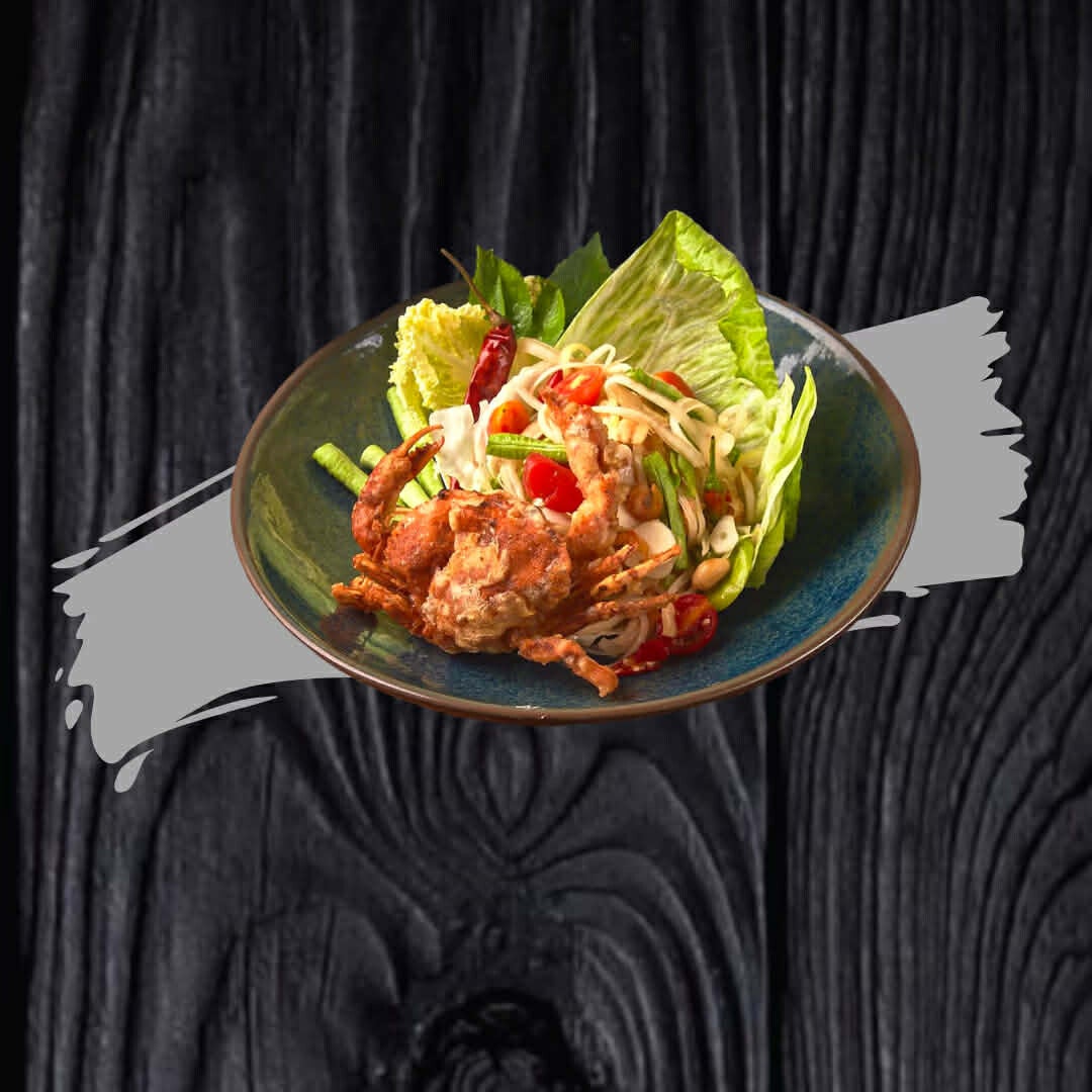 Papaijasalaattia sekä "Softshell" pehmeäkuorista taskurapua ja pähkinöitä.