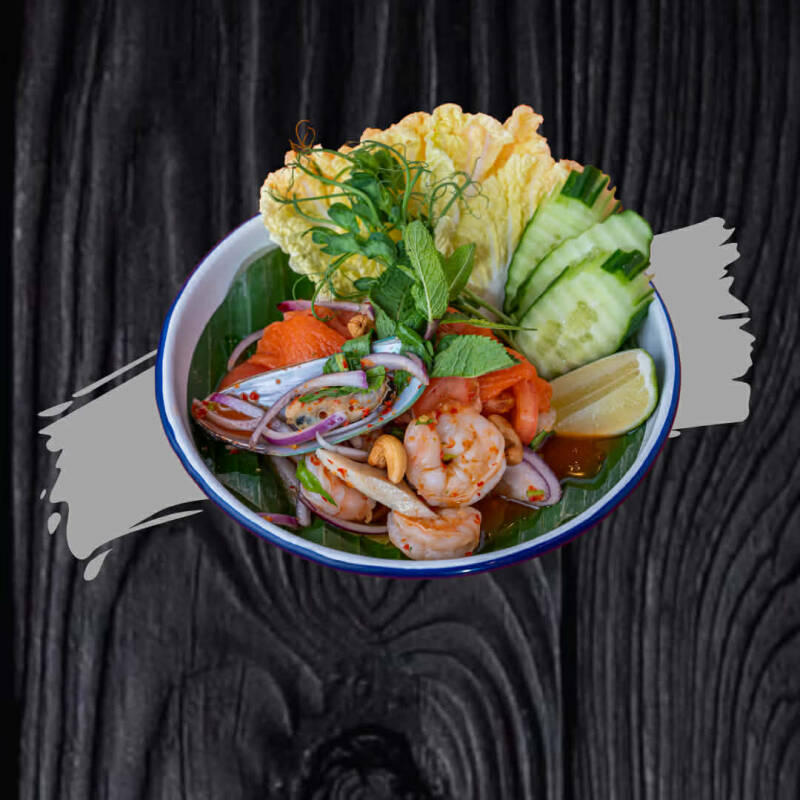 Erittäin tulista! Äyriäismix lohisashimi thai salaatti sekä chiliä, limeä, punasipulia, pähkinää, tomaattia.