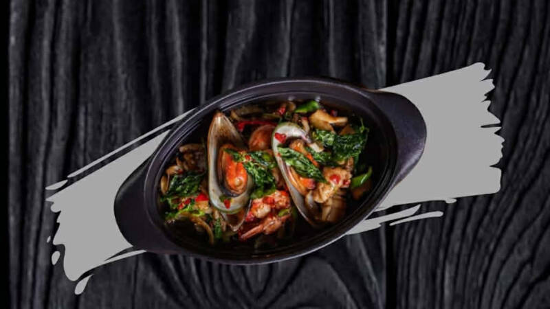 Wokattuja äyriäisiä sekä chiliä ja pyhäbasilikaa soija-osterikastikkeessa.